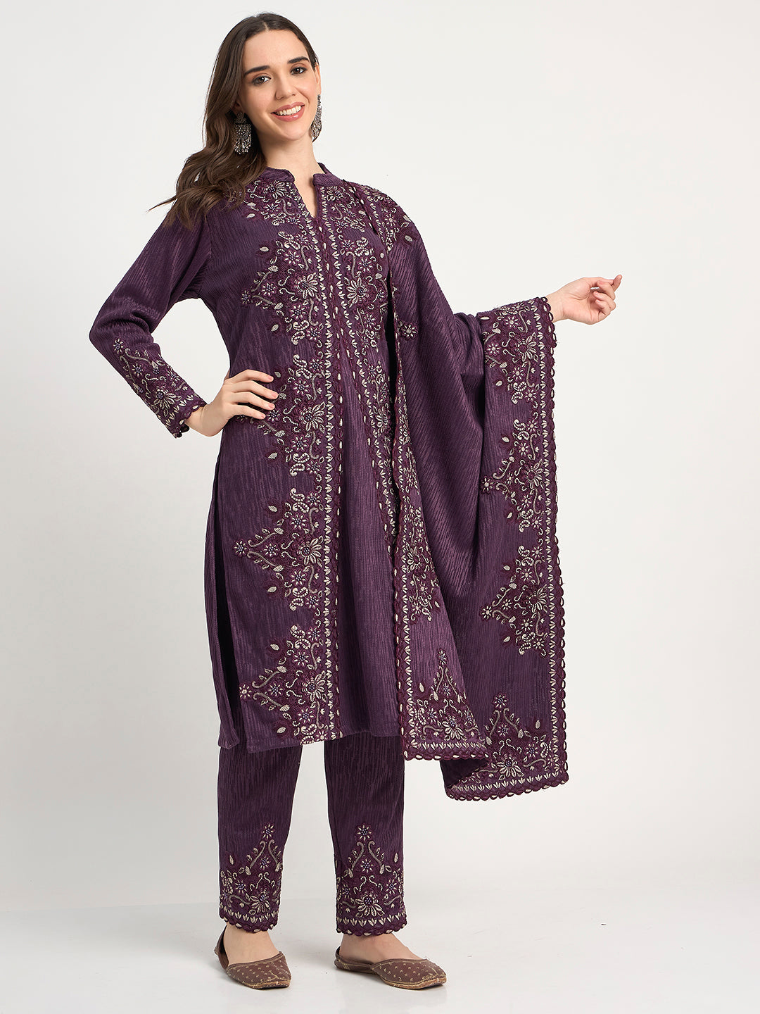 Purple Winter Embroidered Suit Set with Shawl