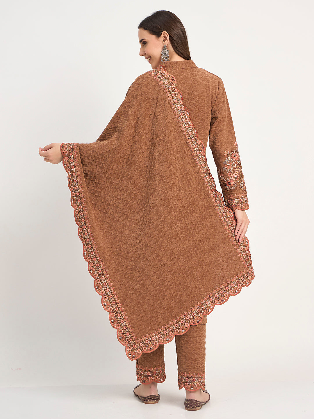 Rust Winter Embroidered Suit Set with Shawl